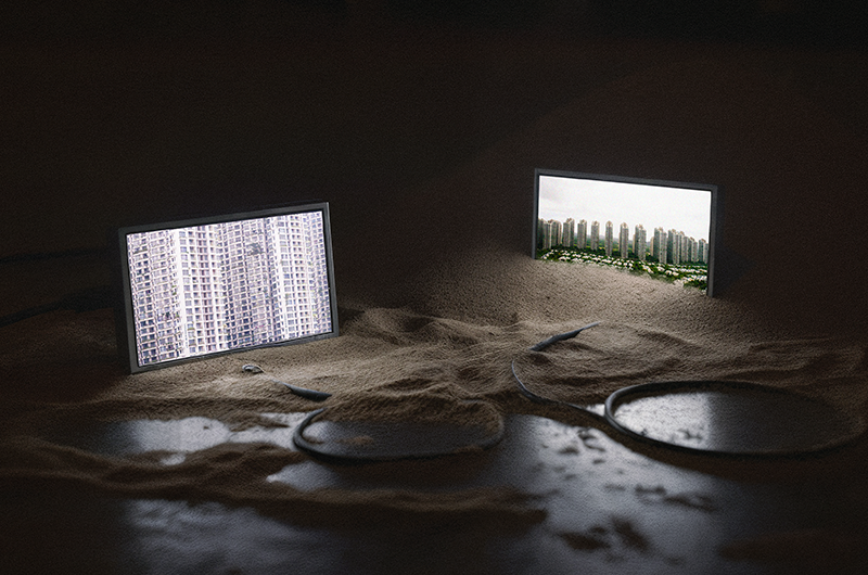 of New Ruins is an installation exploring the 'Singaporean Dream'. Visitors