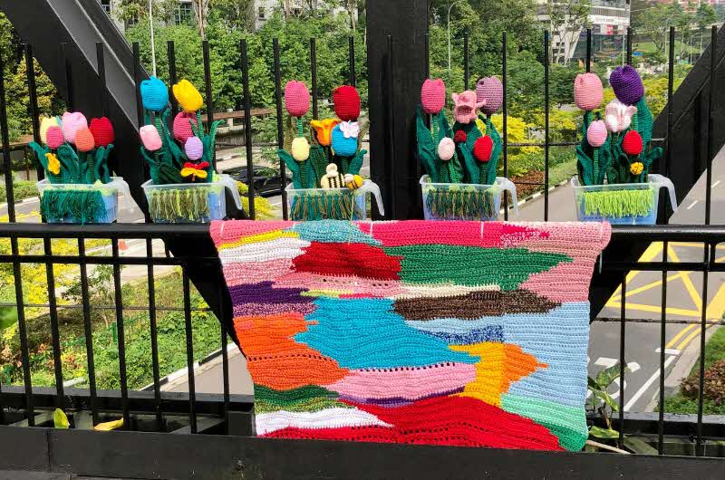Discover a whimsical crochet garden at Armenian Street! Admire vibrant woven bread flowers, blue pea flowers, playful monkeys, curious otters, and majestic hornbills in this enchanting outdoor art experience.